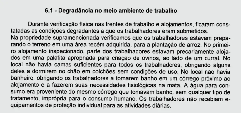 Segundo o documento, os trabalhadores da Diamante não eram registrados, tinham jornadas exaustivas de trabalho e estavam com pagamento de salário atrasado. Também não tinham acesso a Equipamentos de Proteção Individual (EPI) e kit de primeiros socorros, apesar de conviverem com animais peçonhentos nos alojamentos. Alguns dos trabalhadores, ainda, dormiam em barracas de camping improvisadas.