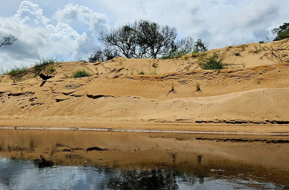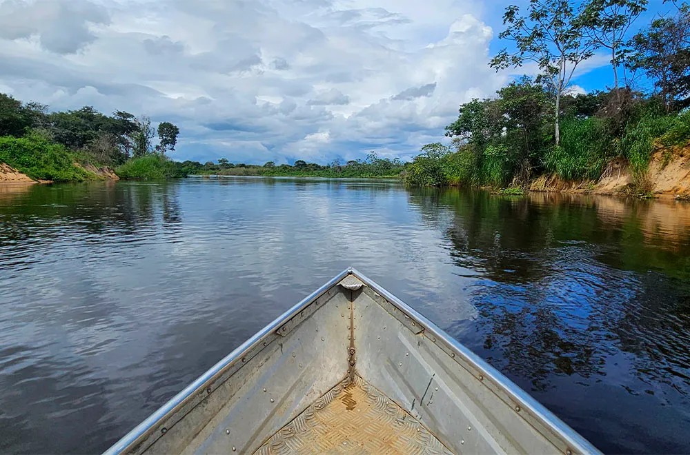 Com a mesma canoa que nos levou até a aldeia, nosso anfitrião nos leva para navegar e mostrar o barramento do rio Dueré. “Esse barramento tampou o rio de cascalho”, conta o indígena. Na época de chuvas, por conta da barragem que mudou o percurso natural do rio, há alagamentos na aldeia.