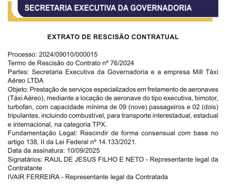 O Diário Oficial trouxe a publicação do extrato de rescisão contratual da Secretaria Executiva da Governadoria com a empresa Mill Táxi Aéreo LTDA.