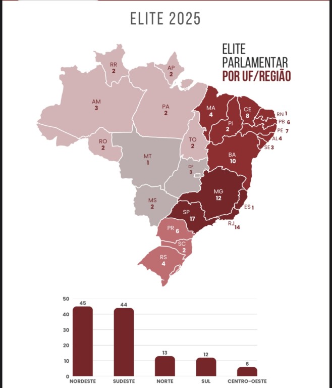 A Elite Parlamentar Arko Advice 2025 é formada por 120 parlamentares: 79 deputados federais e 41 senadores. PT, União, PL, PP e PSD lideram o ranking.