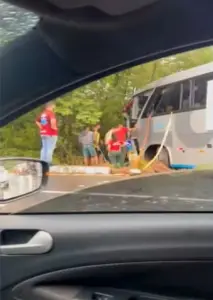 O acidente foi registrado nesta sexta-feira (20). Imagens que circulam nas redes sociais mostram que a parte da frente do ônibus ficou destruída e, por causa do impacto, ele saiu da pista. Já a parte traseira do caminhão ficou amassada. Muitas pessoas pararam para ajudar e o caminhão estava no acostamento.