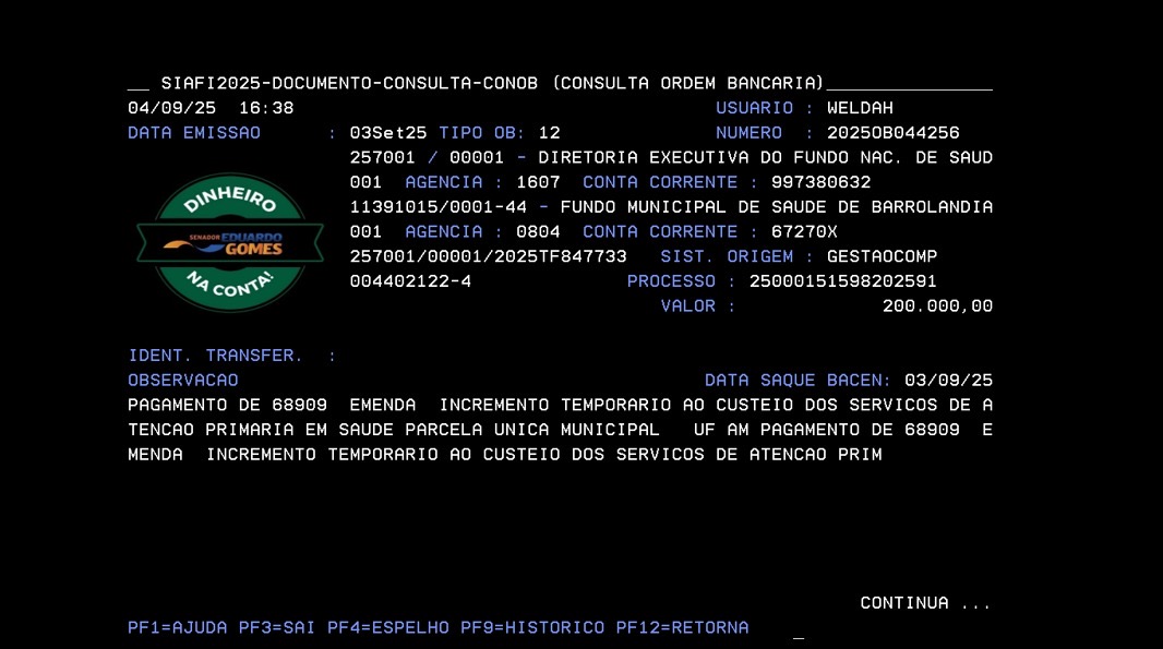 O Ministério da Saúde liberou R$ 200 mil que o senador destinou para incremento á saúde em Barrolândia.