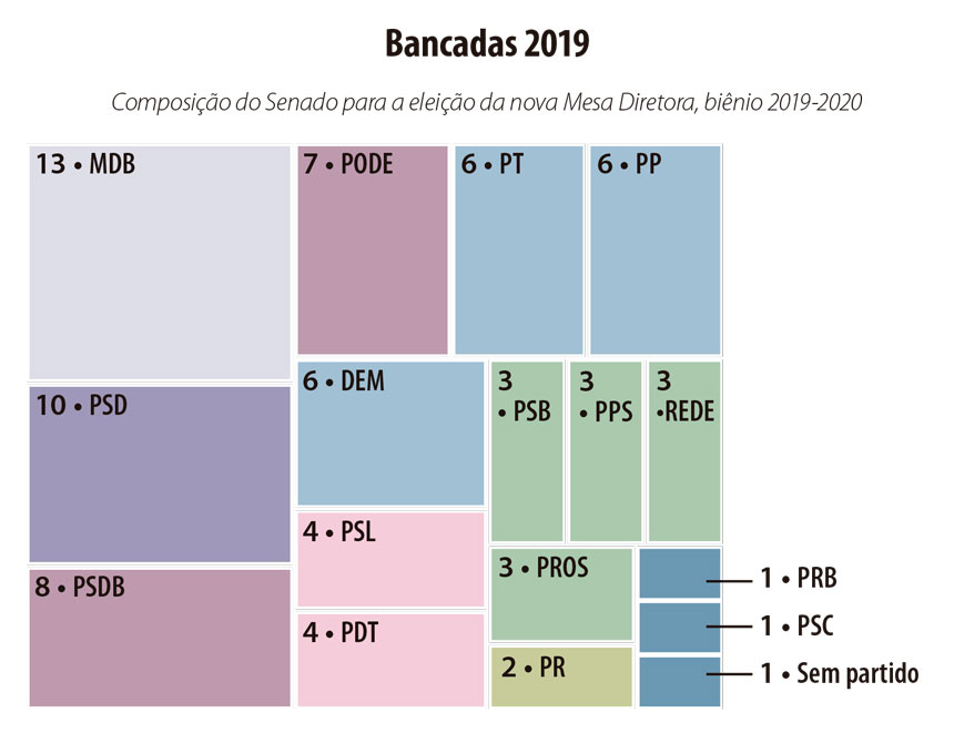 Segundo a Secretaria-Geral da Mesa, os líderes já indicados são os seguintes: Eduardo Braga (MDB-AM); Otto Alencar (PSD-BA); Alvaro Dias (PODE-PR); Rodrigo Pacheco (DEM-MG); Daniella Ribeiro (PP-PB); Weverton Rocha (PDT-MA); Major Olimpio (PSL-SP); Eliziane Gama (PPS-MA); Jorge Kajuru (PSB-GO); e Jorginho Mello (PR-SC). Ainda precisam definir os líderes as bancadas do PSDB, PT, Rede, Pros, PRB e PSC.