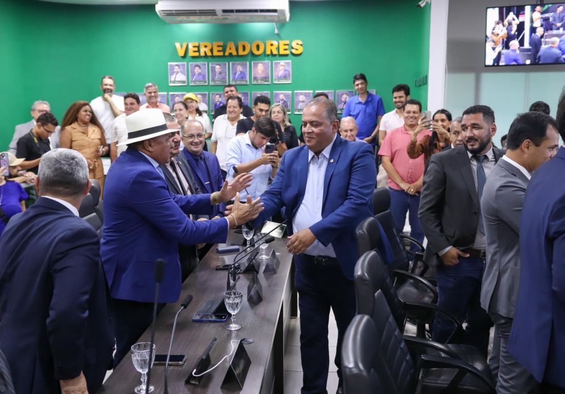 Ao receber a comenda, Eduardo Gomes recebeu depoimentos de vários vereadores presentes destacando a atenção com eles e um até fez questão de relembrar que ganhou do senador o terno para tomar posse. Da plateia, Padeirinho já achou uma foto e mostrou que foi agraciado com um também para a posse.