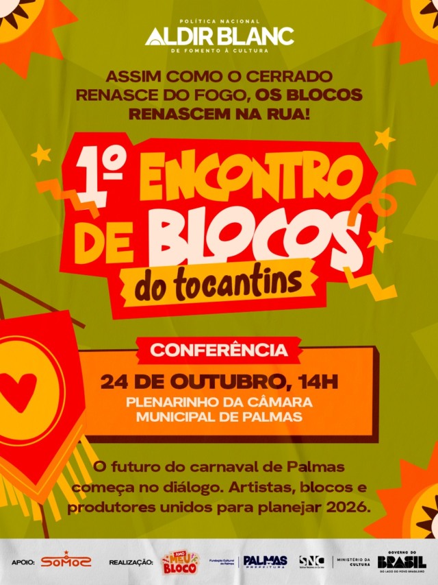 O carnaval de rua do Tocantins se prepara para um novo capítulo. No dia 24 de outubro, às 14h, o Plenarinho da Câmara de Vereadores de Palmas recebe o 1º Encontro de Blocos do Tocantins, iniciativa que pretende unir tradição e juventude para construir, de forma colaborativa, o futuro da folia nas ruas da capital.