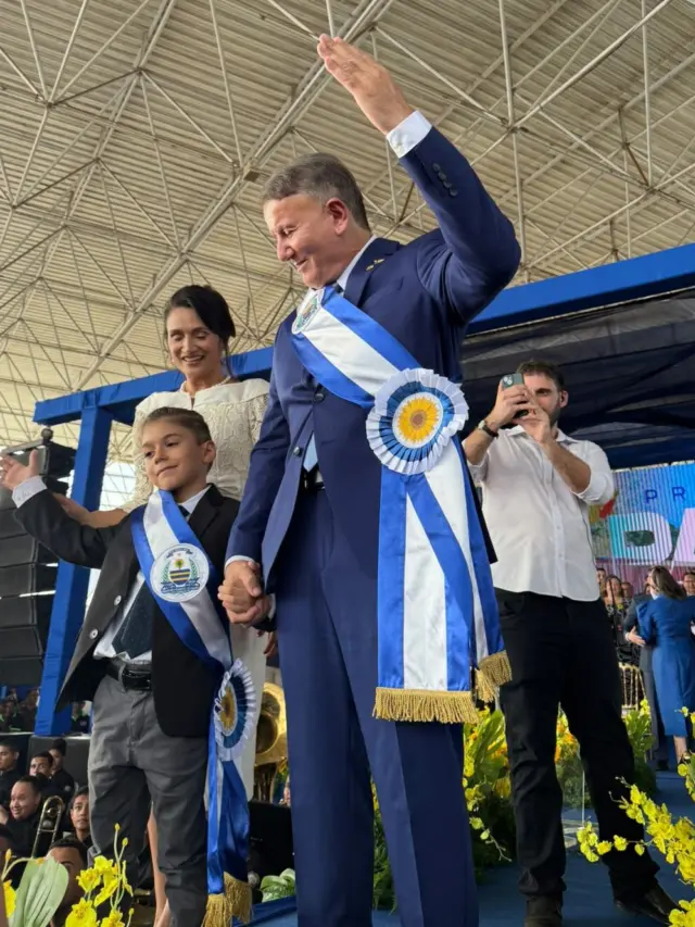 Eduardo Siqueira Campos recebeu a faixa de novo prefeito das mãos da ex gestora Cinthia Ribeiro. O seu filho Gael, chamado de miniprefeito, também recebeu uma faixa simbólica.