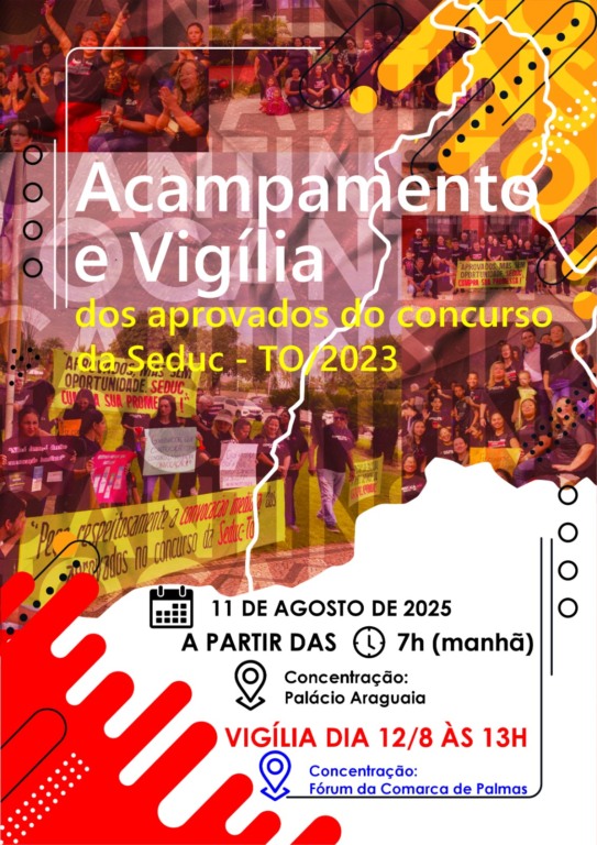A Comissão de Aprovados no concurso da Secretaria de Estado da Educação do Tocantins (Seduc-TO), Edital nº 01/2023, está organizando um acampamento e uma vigília nos dias 11 e 12 de agosto em Palmas. O objetivo é intensificar a pressão pela nomeação de todos os candidatos aprovados.