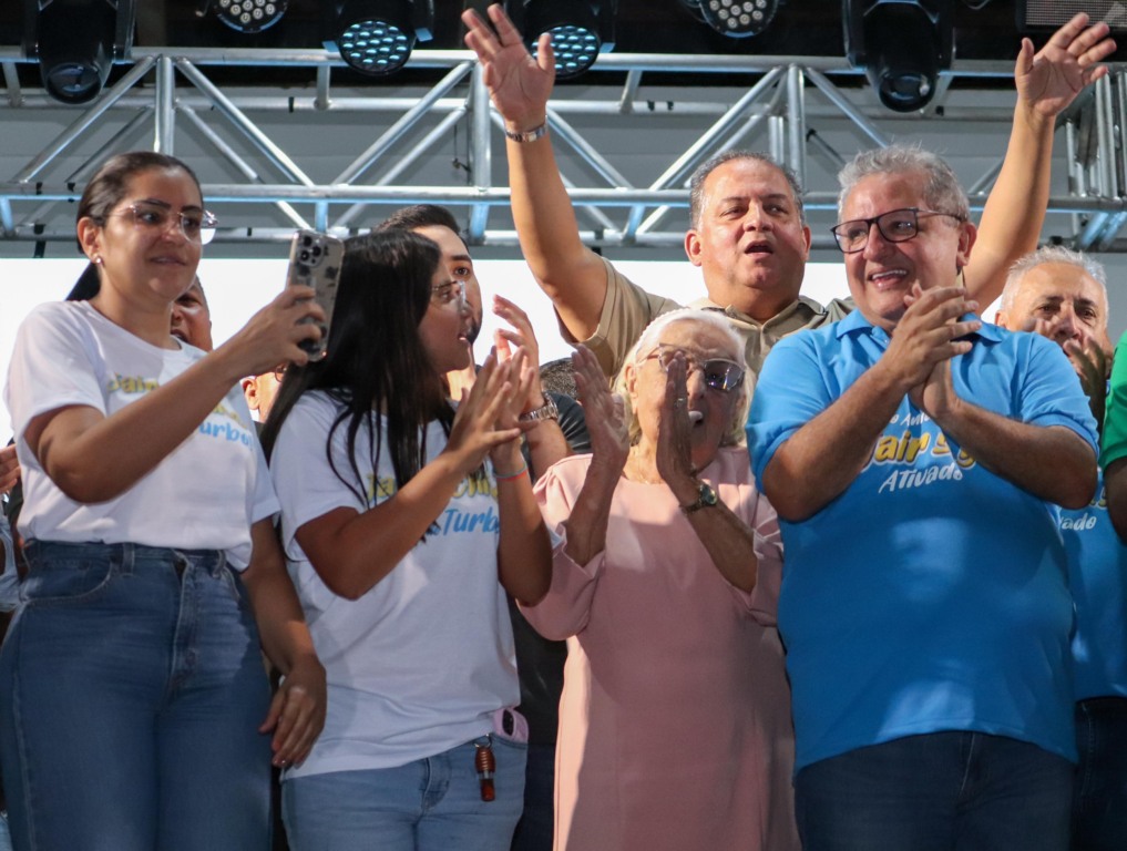 Uma cena que chamou atenção no aniversário foi a presença da dona Maria Farias, mãe de Jair, que é muito apegada com ele e fez questão de subir no palco e acompanhar de pé o momento do discurso dele. Ela não esconde a admiração pelo filho.