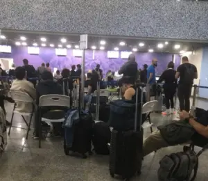 Nos vídeos gravados por passageiros, é possível ver a sala de espera do aeroporto da capital lotada de pessoas em pé e sentados nos bancos esperando para remarcar as viagens.