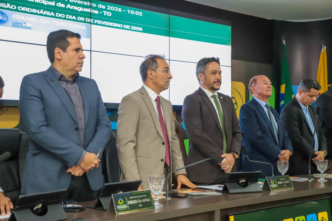 Com um plenário repleto de lideranças políticas e empresários tocantinenses, a Câmara de Vereadores de Araguaína retomou as atividades na manhã desta segunda-feira, 9. A sessão marcou o início primeiro semestre legislativo de 2026, conduzida pelo presidente da casa, o vereador Max Fleury e com a presença dos deputados federais Tiago Dimas e Lázaro Botelho, deputados estaduais Marcus Marcelo, Jorge Frederico, Gipão e Amélio Cayres, atual presidente da Assembleia Legislativa do Tocantins (Aleto), além do prefeito de Araguaína Wagner Rodrigues.