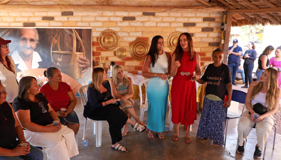 Recepcionadas com cantigas autorais que narram a história do quilombo, a primeira-dama Karynne Sotero e a atriz Luiza Brunet participaram da roda de conversa, conhecendo de perto a essência comunitária e as potencialidades naturais do Cerrado, entre elas, o conhecimento sobre plantas medicinais e o rico artesanato produzido a partir do capim-dourado, planta nativa e abundante da região, símbolo da identidade cultural do Jalapão.