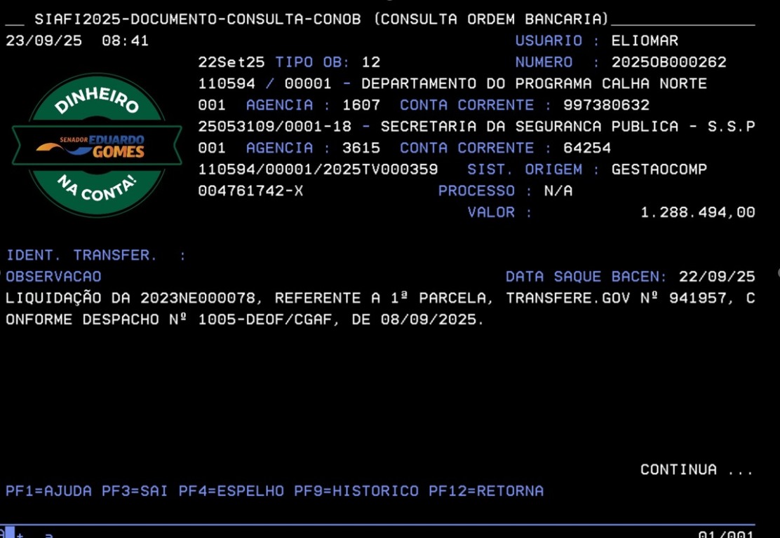 Foi liberado o valor de R$ 1,2 milhão para a Secretaria de Segurança Pública do Tocantins. O valor foi destinado pelo senador Eduardo Gomes através do programa Calha Norte para a compra de quatro viaturas especiais para a polícia.