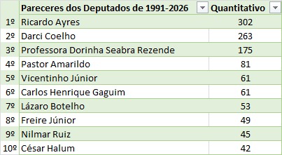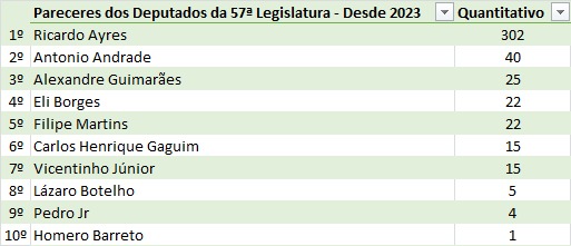 Nesta legislatura, iniciada em 2023, o desempenho de Ayres também se destaca de forma expressiva. O parlamentar apresenta um volume de pareceres quase 800% superior ao do segundo colocado, o deputado Antonio Andrade (PSDB-TO), que soma 40 pareceres. Em seguida aparecem Alexandre Guimarães (MDB-TO), com 25, Eli Borges (Republicanos-TO) e Filipe Martins (PL-TO), com 22 cada, além de Carlos Henrique Gaguim (União-TO) e Vicentinho Júnior (PP-TO), com 15 pareceres cada.