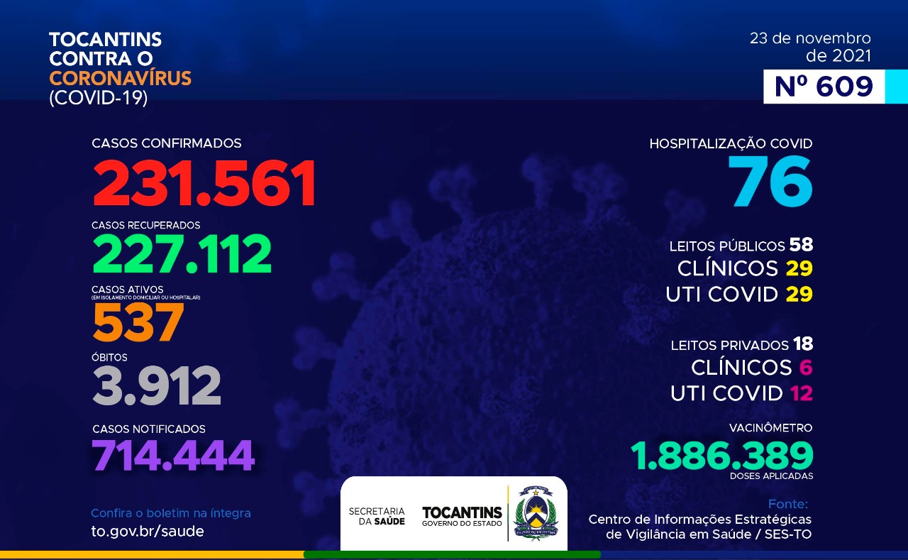 Atualmente, o Tocantins contabiliza 714.444 pessoas notificadas com a Covid-19 e acumula 231.561 casos confirmados. Destes, 227.112 estão recuperados, 537 pacientes seguem em isolamento domiciliar ou hospitalar e 3.912 foram a óbito.