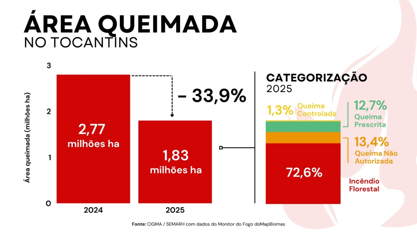 Entre janeiro e novembro de 2025, foram queimados 1.834,6 mil hectares no Tocantins. Em 2024, no mesmo período, o fogo atingiu 2.775,7 mil hectares de cobertura vegetal. De acordo com a categorização, 72,6% da área queimada refere-se a incêndios florestais; 13,4%, a queimas não autorizadas; e 12,7%, à queima prescrita.