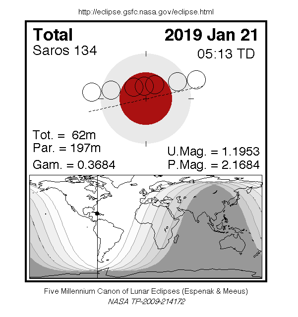 Este gráfico da NASA oferece detalhes básicos sobre o eclipse lunar total de 21 de janeiro de 2019. O círculo vermelho é a sombra mais escura da Terra, a umbra. O grosso anel cinza ao redor representa a parte externa da sombra da Terra, a penumbra. Os finos anéis pretos indicam a posição da lua enquanto ela se move através da sombra da Terra. Crédito: Espenak / Meeus / NASA / GSFC